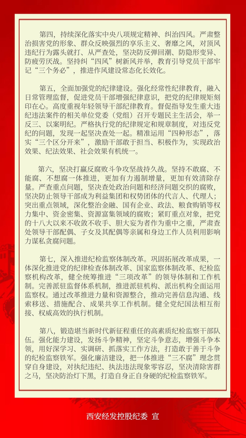 經(jīng)發(fā)控股紀(jì)委要求各級(jí)黨組織深入學(xué)習(xí)中央紀(jì)委二次全會(huì)公報(bào)精神,對(duì)標(biāo)對(duì)表謀劃全年工作,堅(jiān)決抓好貫徹落實(shí),以實(shí)際行動(dòng)維護(hù)企業(yè)良好政治生態(tài)。一是要提高站位,統(tǒng)一思想認(rèn)識(shí)。黨組織負(fù)責(zé)人要履行好“一崗雙責(zé)”,充分認(rèn)識(shí)中央紀(jì)委二次全會(huì)召開的重要意義,了解掌握上級(jí)的主要部署安排,推動(dòng)各項(xiàng)工作良好開展。二是要堅(jiān)定篤行,全力抓好落實(shí)。黨組織要立足企業(yè)實(shí)際,真正把貫徹落實(shí)二十屆中央紀(jì)委二次全會(huì)公報(bào)精神體現(xiàn)到各項(xiàng)具體工作之中,緊扣集團(tuán)管理方針,深入落實(shí)“五個(gè)圍繞”“五個(gè)推進(jìn)”,確保方向準(zhǔn)、目標(biāo)清,更好地服務(wù)保障企業(yè)高質(zhì)量發(fā)展。三是要強(qiáng)化規(guī)范意識(shí),持續(xù)推進(jìn)落實(shí)中央八項(xiàng)規(guī)定精神。作風(fēng)建設(shè)永遠(yuǎn)在路上,糾治“四風(fēng)”任重道遠(yuǎn),必須將“嚴(yán)”字長(zhǎng)期堅(jiān)持下去。鍥而不舍正風(fēng)肅紀(jì),堅(jiān)定不移防治腐敗,更好地為企業(yè)發(fā)展?fàn)I造風(fēng)清氣正的政治生態(tài)和干事創(chuàng)業(yè)的優(yōu)良環(huán)境。四是要強(qiáng)化運(yùn)用監(jiān)督執(zhí)紀(jì)“第一種形態(tài)”,筑牢廉潔“第一道防線”。讓咬耳扯袖、紅臉出汗成為常態(tài),真正做到把紀(jì)律挺在前面,防止“小病”變“頑疾”。五是要強(qiáng)化廉政風(fēng)險(xiǎn)預(yù)警防控,根據(jù)《廉政風(fēng)險(xiǎn)防控管理辦法》要求,督促本公司深入開展廉政風(fēng)險(xiǎn)排查,建立起風(fēng)險(xiǎn)摸排準(zhǔn)確、防控措施完備、責(zé)任劃分明確的廉政風(fēng)險(xiǎn)管理臺(tái)賬,確保制度有效落地執(zhí)行。